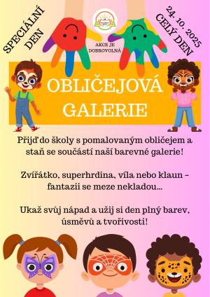 V pátek 24. října 2025 se na naší škole uskuteční speciální tematický den s názvem Obličejová galerie. Účast na akci je dobrovolná. Těšíme se na den plný fantazie, úsměvů a příjemné atmosféry.
